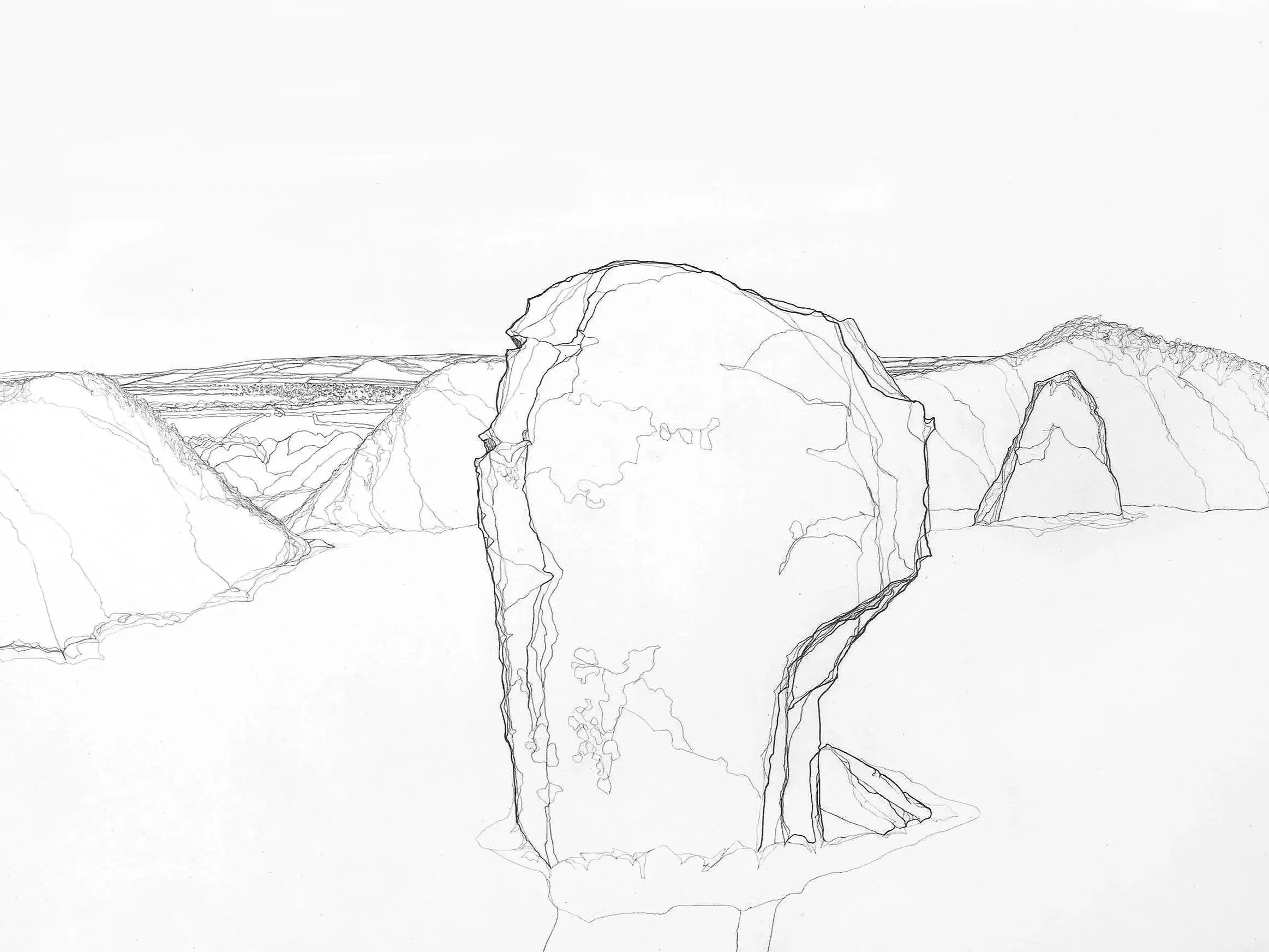 BRINK presents drawings by Hughes that demonstrate an enduring fascination with the ancient landscapes of Britain. His line traces those elements of the land that endure and disregards all else. Stone, tracks, coastal shelves, the line of a ridge. In choosing these elements of the land to draw, Hughes’ work presents a timescale that reaches beyond the individual.