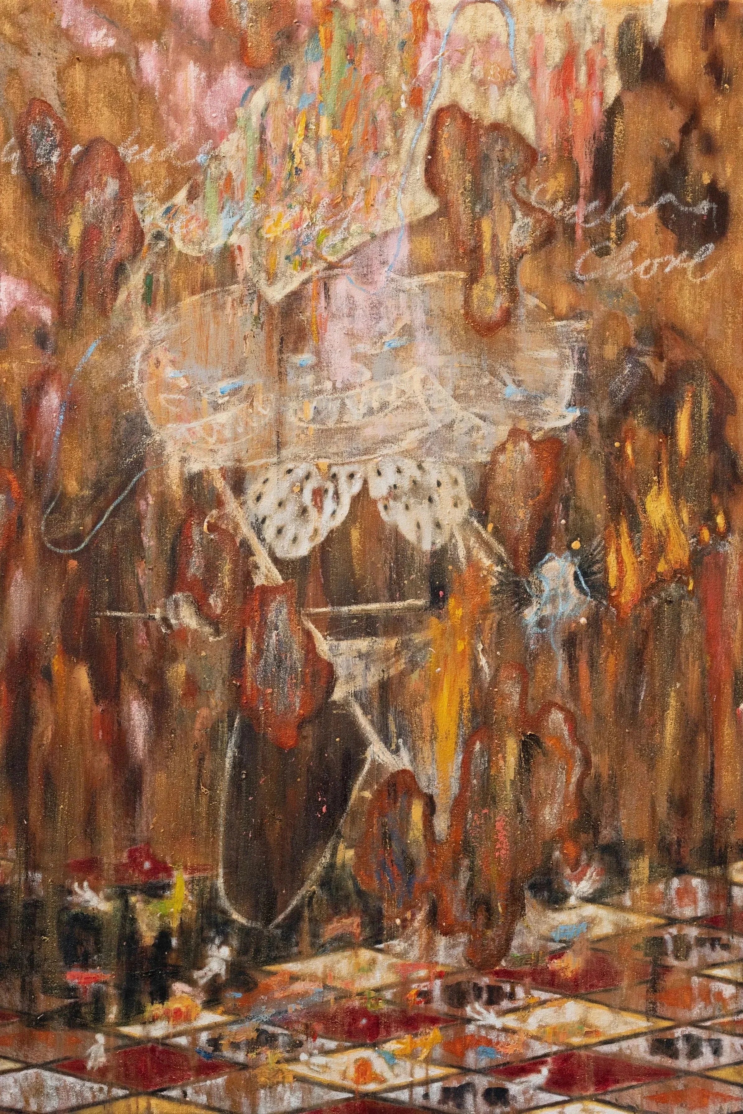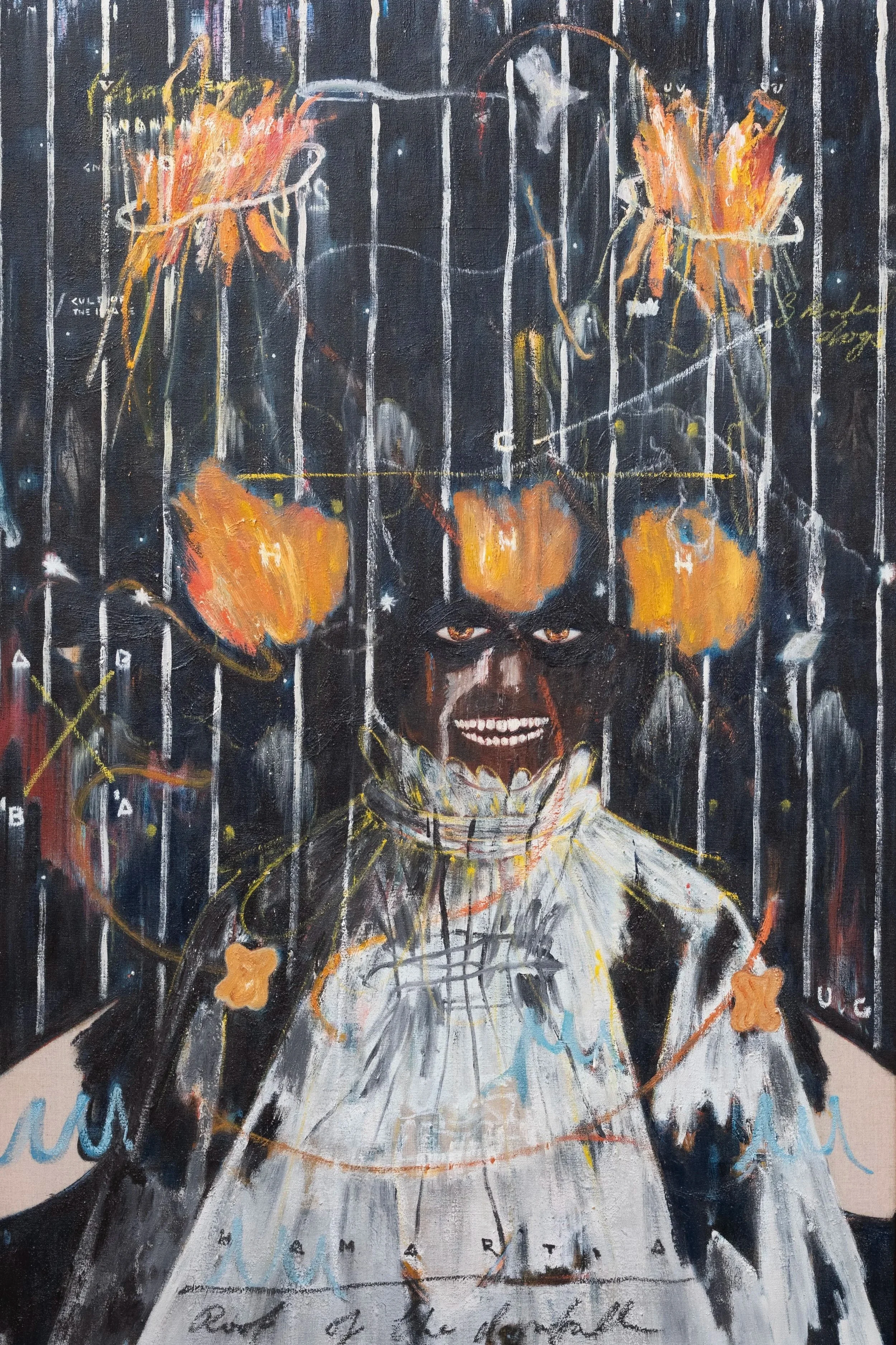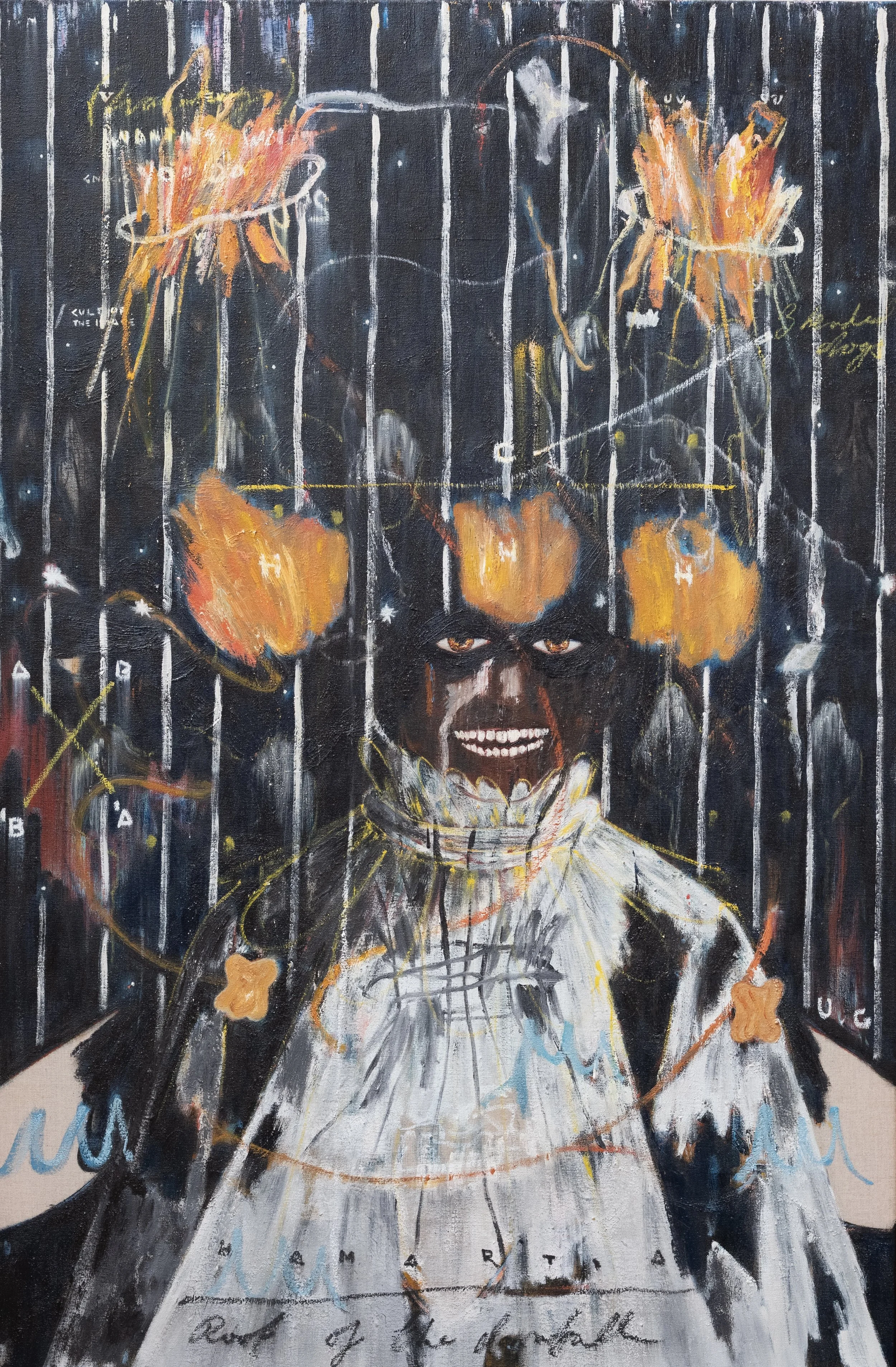 Working from this studio, Gasei has produced nine new works for Console Rites. Primarily oil on canvas, the pictures employ symbols derived from history and myth that serve to examine the artist’s past. In so doing, these symbols are placed under pressure; the canines of a baboon or a galloping horseman, compelled to fight for significance on a canvas dense with competing iconography.
