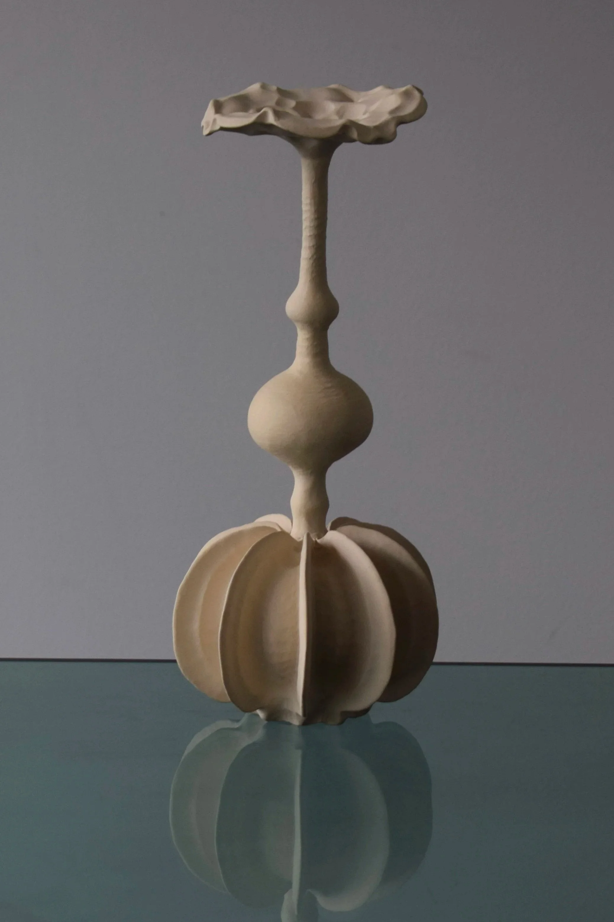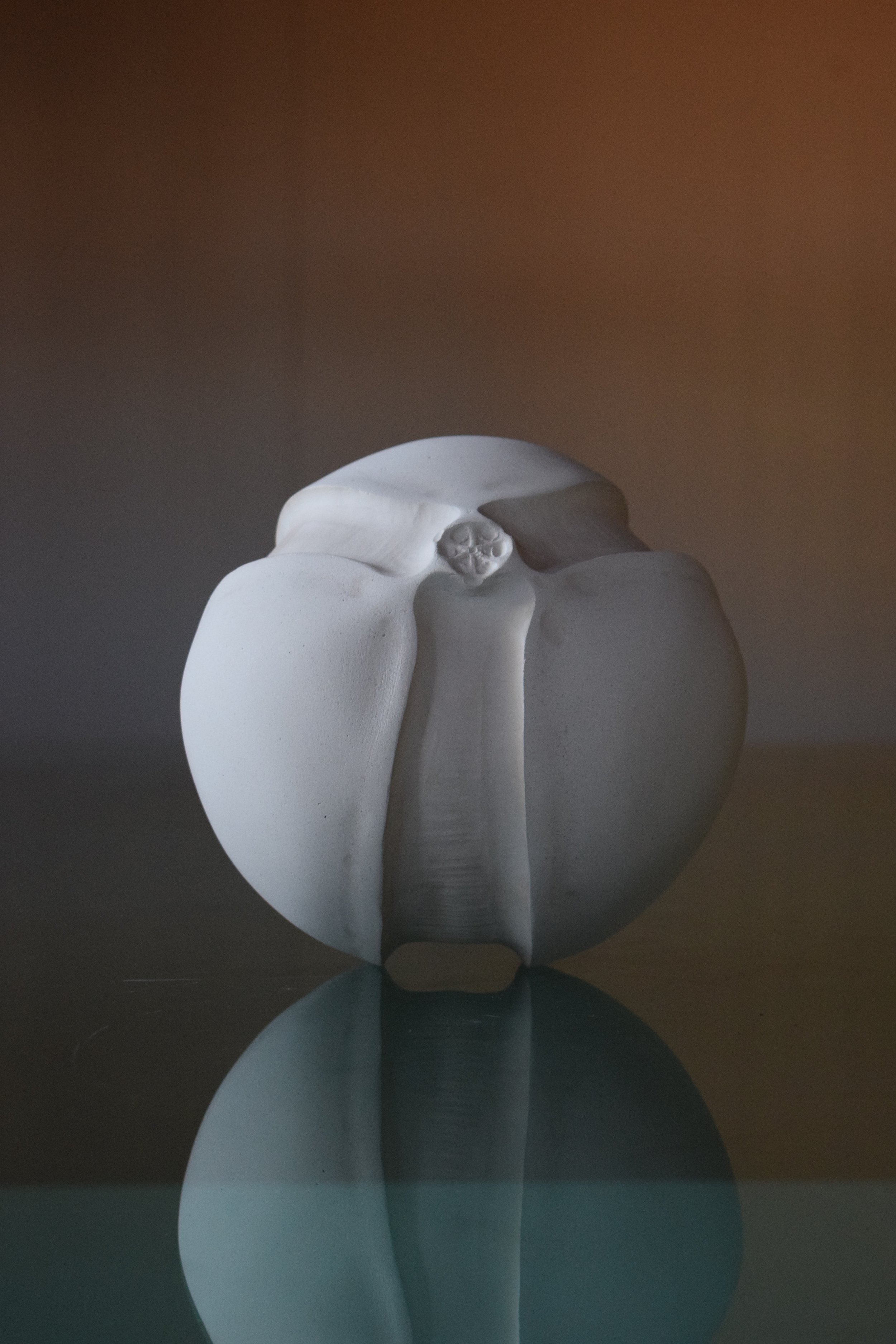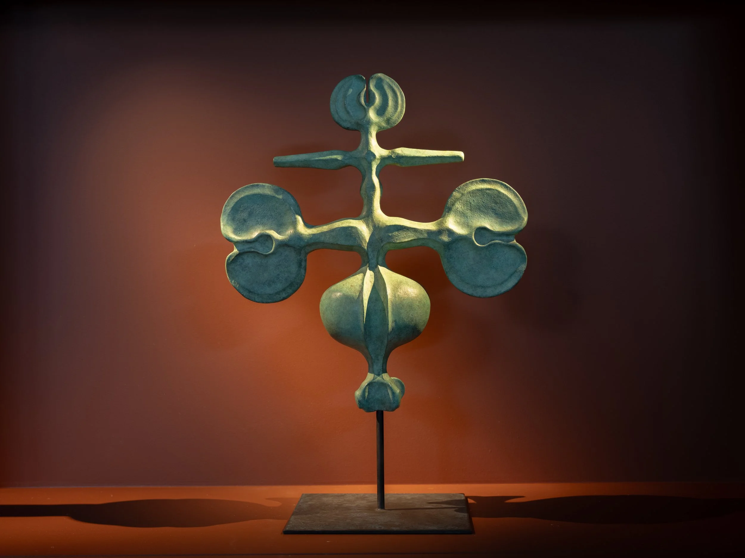 Hamel Cooke’s work is silent and still. It is surprising that such things can be made today. Things made of clay and bronze that stand immobile; do not threaten, inform or serve.It is surprising to come across such things because the night sky is no longer cold and silent. It rumbles with Heathrow’s next arrival and on bright white screens, information is shown through the night before empty roundabouts. Looking at Hamel Cooke’s work is to turn away from information and entertainment, and to reassociate oneself with silence, with the geologic time of mountains. To look and know it is clay (was earth) shaped by thumbs and fingers. To see a strange coherence of familiar forms charged with a life that we cannot know. A womb tomb. A life that reaches, hears, knows itself and is beyond us- as the night sky once was.